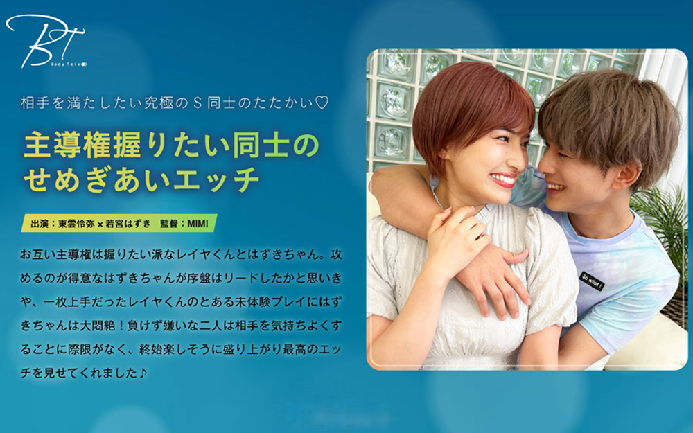 お互い主導権は握りたい派なレイヤくんとはずきちゃん。攻めるのが得意なはずきちゃんが序盤はリードしたかと思いきや、一枚上手だったレイヤくんのとある未体験プレイにはずきちゃんは大悶絶!負けず嫌いな二人は相手を気持ちよくすることに際限がなく、終始楽しそうに盛り上がり最高のエッチを見せてくれました♪